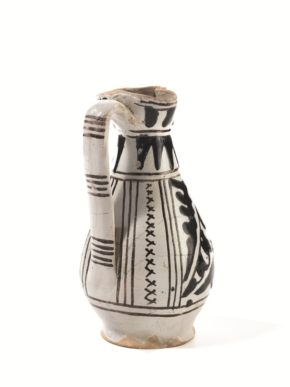 Il boccale ritenuto opera fiorentina della prima metà del XV secolo, è stato pubblicato da Galeazzo Cora (3) nel suo monumentale studio sulla ceramica di Firenze e del contado. Oggi, alla luce degli scavi più recenti, non possiamo più concordare con tale paternità: la morfologia non corrisponde ai boccali toscani, ma ci fa propendere per una produzione dell’Alto Lazio.
