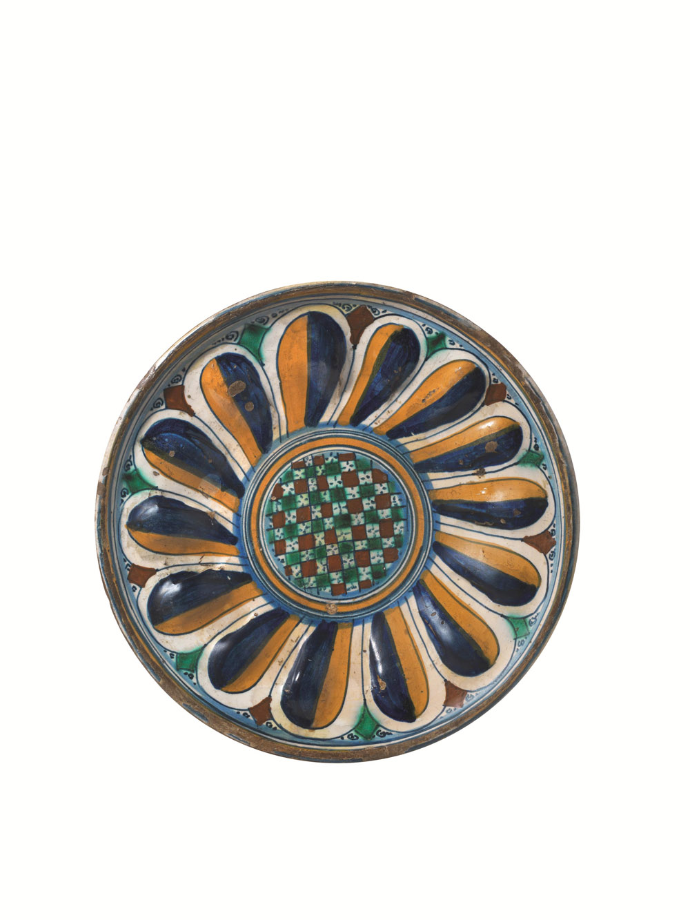 Il decoro dipendeva dalla morfologia dell’oggetto, e quello proposto su quest’opera è particolarmente significativo: le baccellature sono rimarcate dalla bicromia giallo-blu che dà rilievo alla forma, evidenziata e riservata per mezzo di una sottile filettatura in blu di cobalto. Tra le baccellature e la tesa si scorge un piccolo motivo a punta di diamante, esaltato anch’esso dall’uso della bicromia in rosso ferro e verde. Gli spazi vuoti sono poi riempiti da sottili spirali blu. Il centro dell’umbone è interessato da una scacchiera fitta, con sottili decori blu, a riempimento delle parti a riserva, tra le quadrettature verdi e rosse. Il retro non mostra decori, ed è ricoperto da un ingobbio di color nocciola, steso con rapidità e con una vetrina sottile.