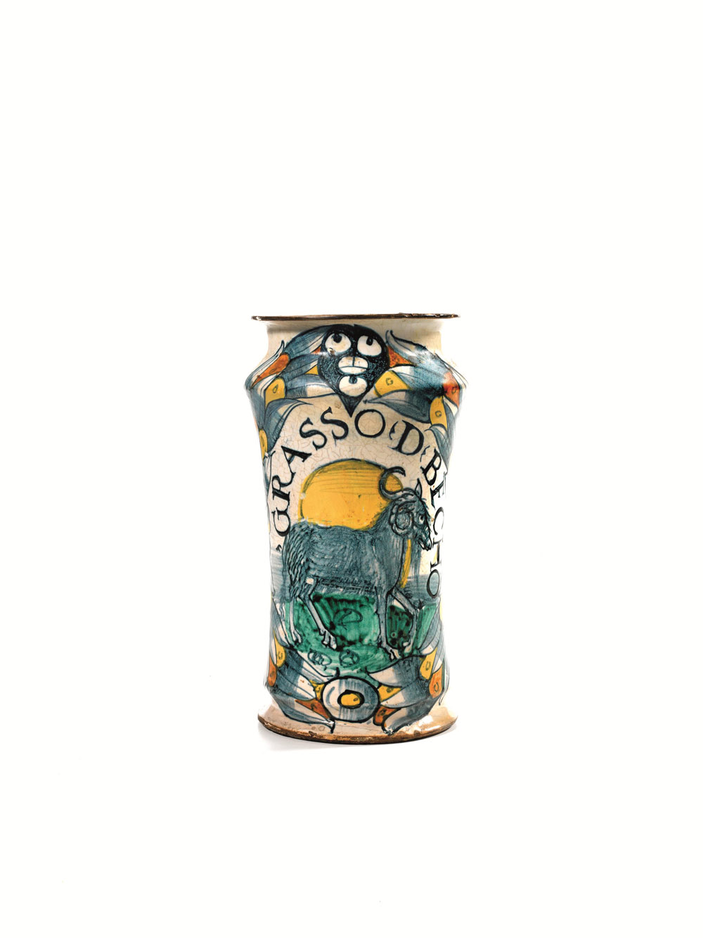 La decorazione, coerente con quella dell’esemplare che segue, mostra sul fronte una corona fogliata con bacche che circonda una riserva contenente la scritta apotecaria redatta in caratteri capitali di colore blu “ GRASSO.D.BECHO ”. Il cartiglio funge da cornice al decoro principale, che qui raffigura un ariete fermo su un prato, con uno sfondo giallo e che riempie, solo parzialmente, lo spazio riservato dalla corona fogliata a sua volta centrata dallo stemma della farmacia. Quest’ultimo, non identificato, mostra uno scudo semplice con tre mezzelune attorno a una palla tagliata in tre porzioni.