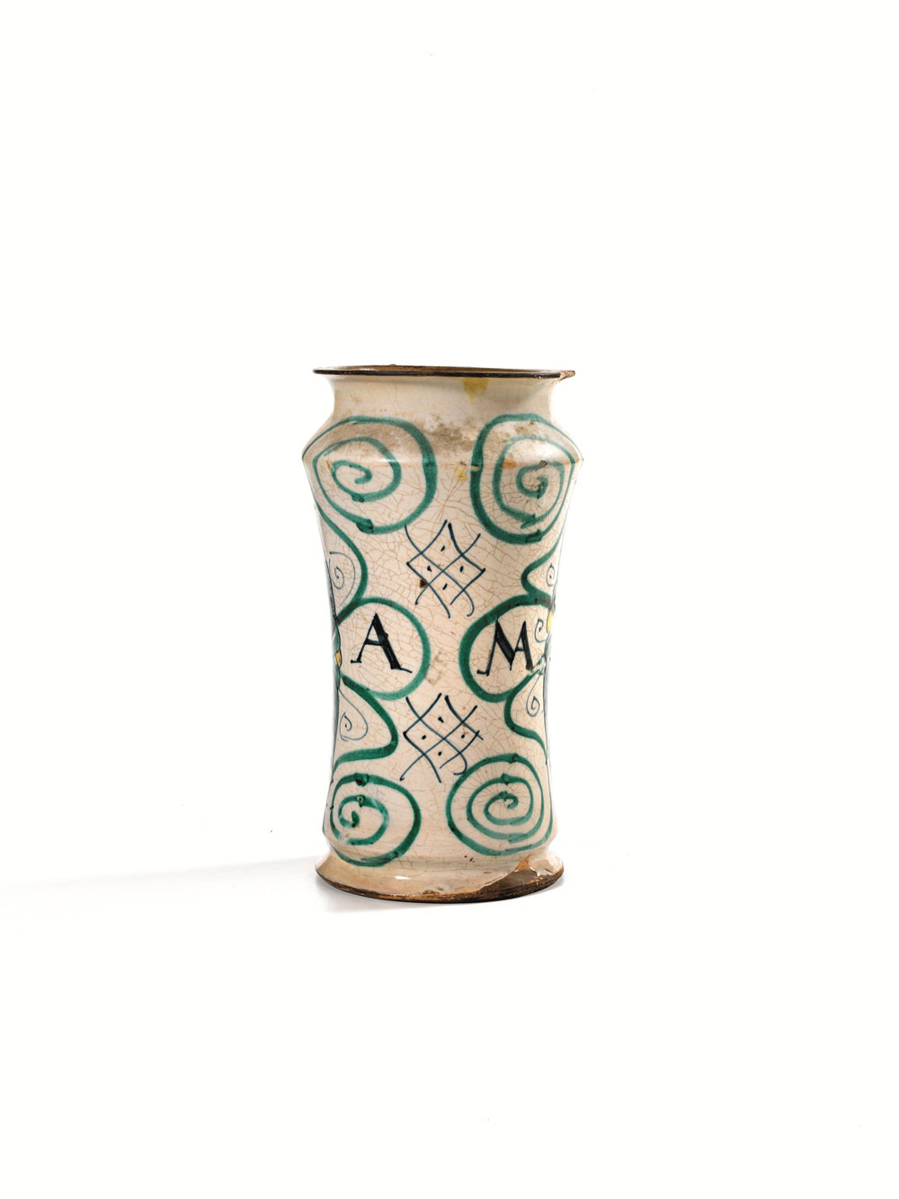 Il retro del vaso mostra un decoro a nastro sinuoso, delineato in verde, interrotto da due ornati a rombi che vanno a incorniciare la sigla A MA .