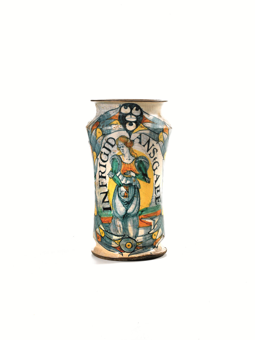 ALBARELLO DERUTA, 1510-1520 Maiolica dipinta in policromia con giallo...
