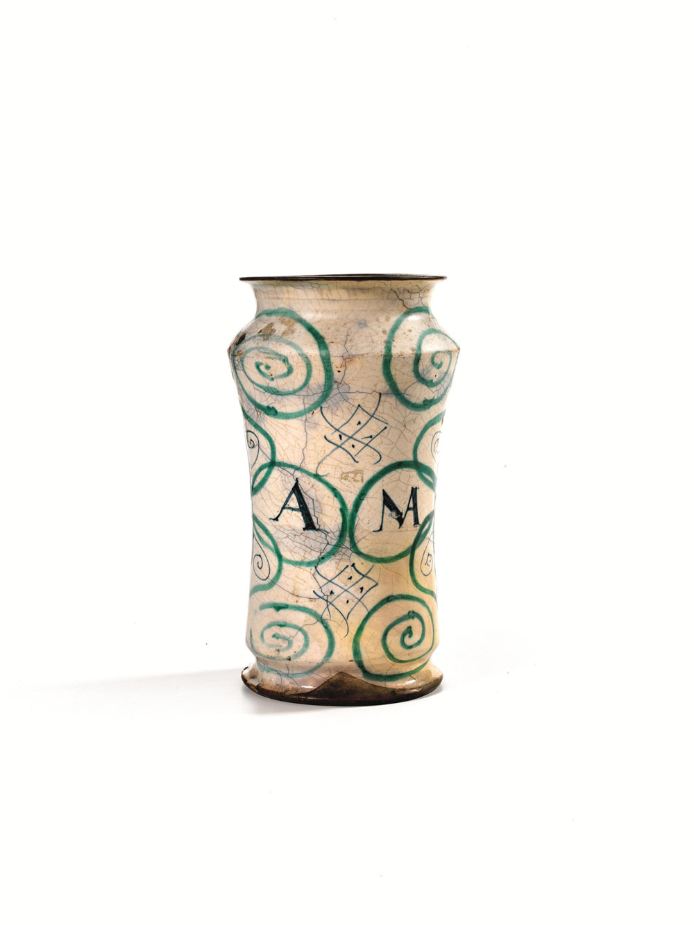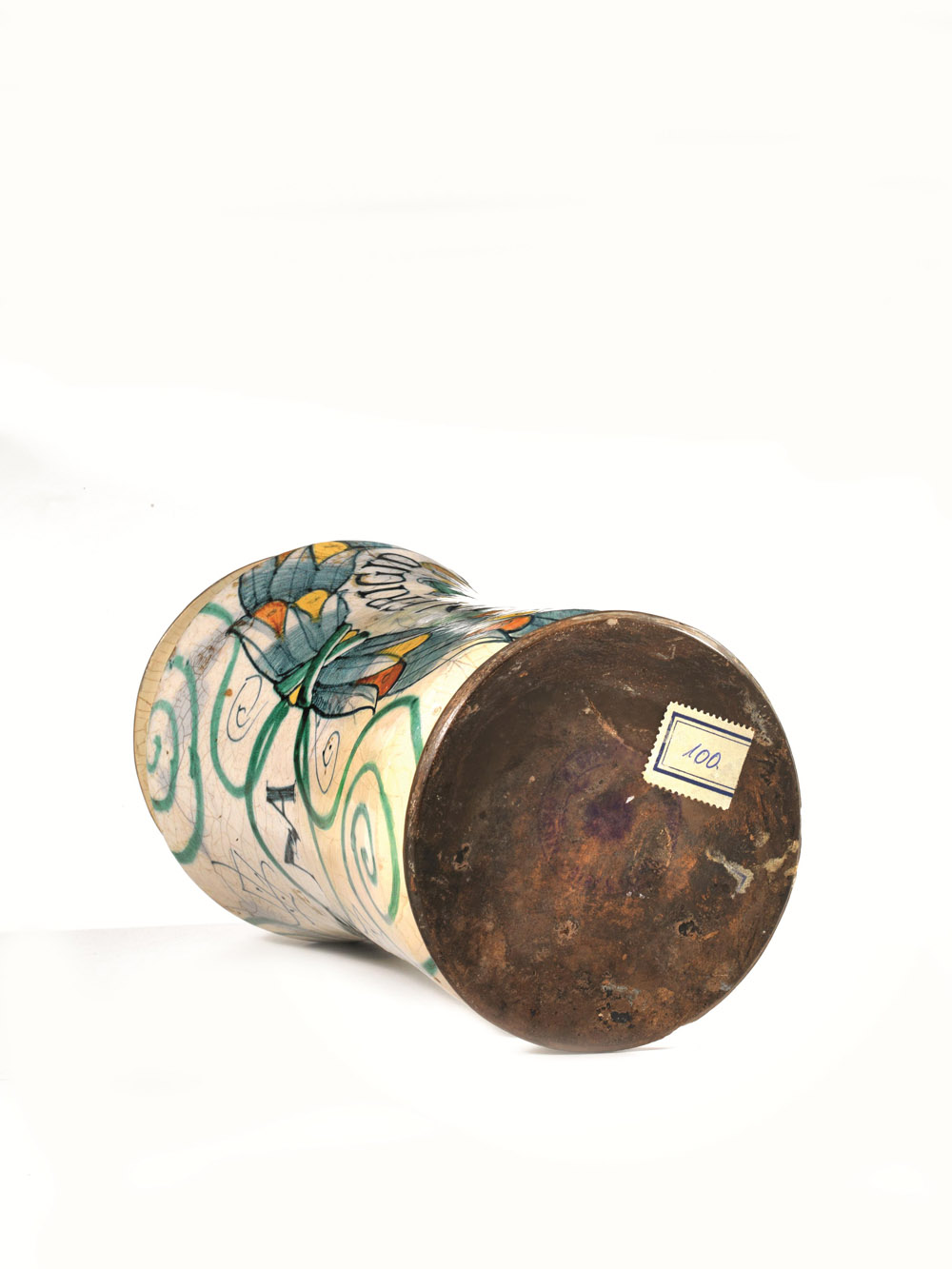 Per confronti e analisi tecnica si rimanda a quanto già detto nell’esemplare che precede salvo aggiungere un confronto stilistico per la figura umana che, pur mantenendo caratteristiche disegnative meno efficaci, ci sembra simile a quelle dipinte sull’importante serie di bottiglie farmaceutiche conservate al Museo del Louvre (1).