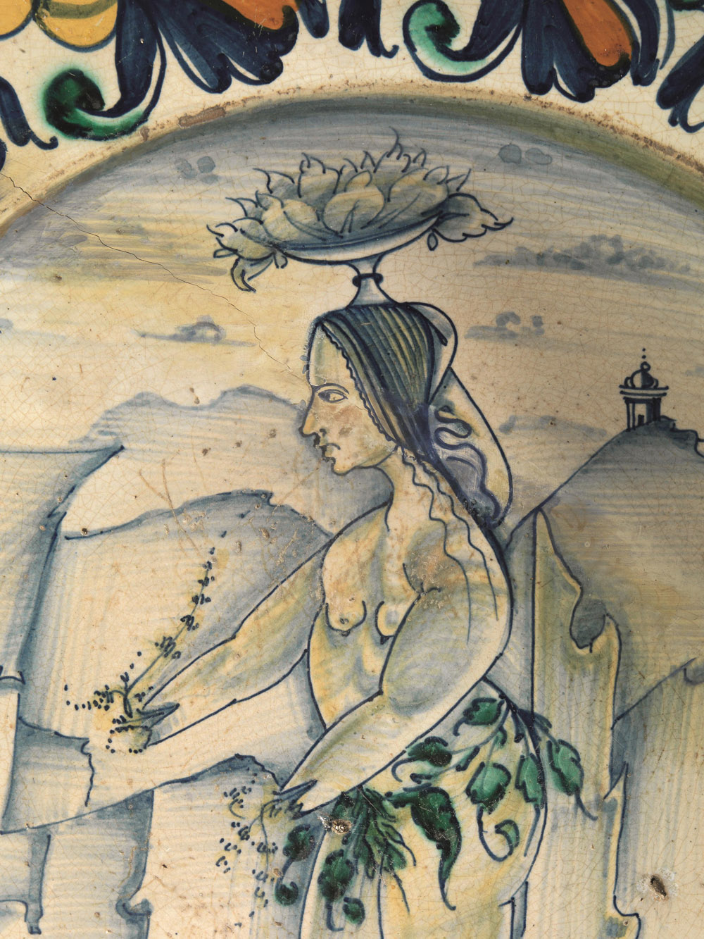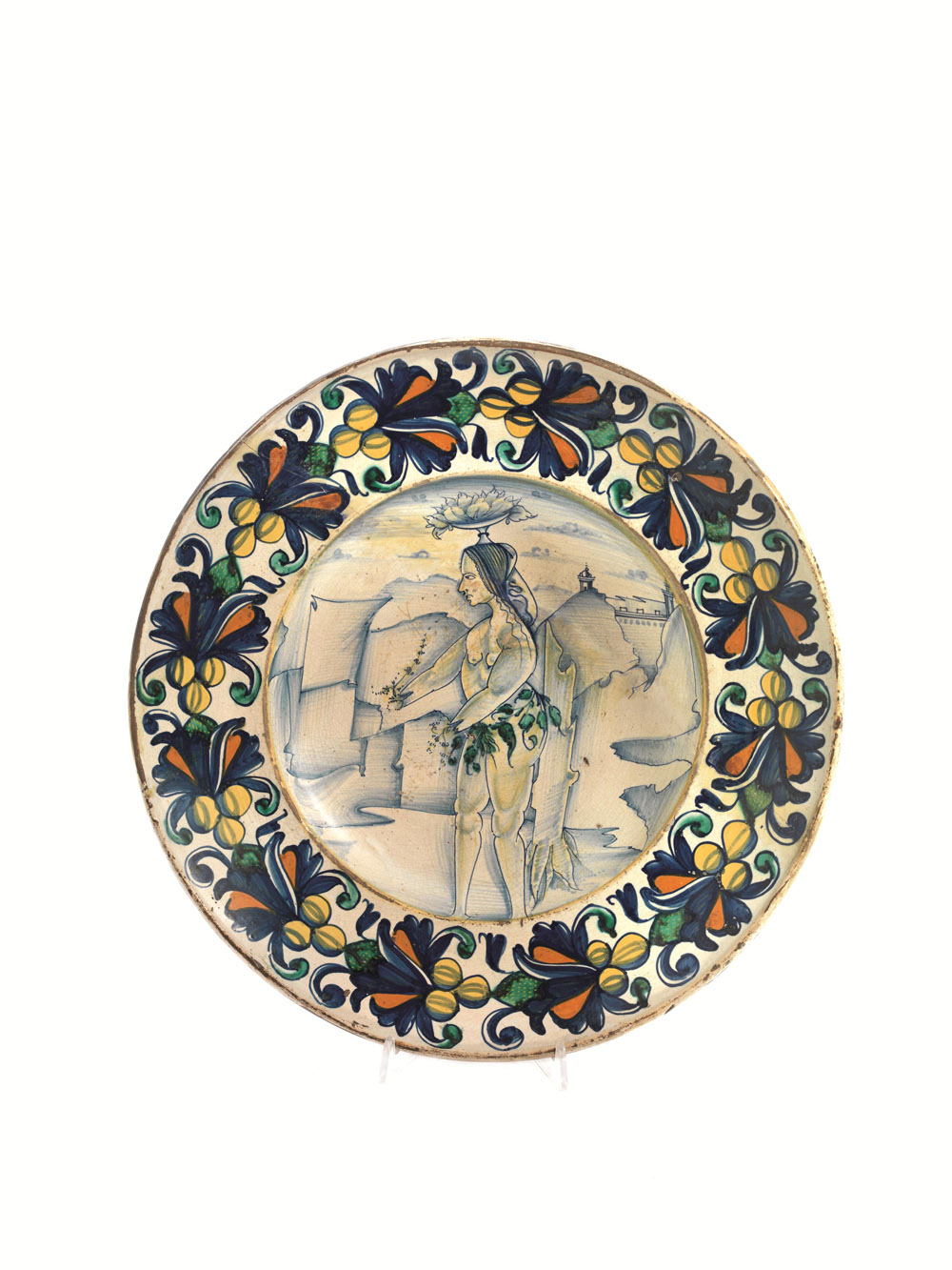 PIATTO DERUTA (?), INIZIO DEL SECOLO XVI Maiolica dipinta in policromia con blu di cobalto, rosso ferraccia, giallo, arancio, verde rame in due toni, giallo antimonio, bistro e tocchi di manganese. Alt. cm 9,8; diam. cm 42; diam. piede cm 14,5. Sul retro etichetta di collezione dattiloscritta: “Plat rond raprésentant: Daphné cangée en laurier/dirigeant vers la gauche, une coupe chargée de feuilles posée/sur la tête . Dessin au trait bleu sur fond blanc. Au marii,/Faenza XVI siècle”.L’esemplare ha la forma caratteristica dei piatti da pompa con un cavetto largo e profondo, una tesa ampia che termina in un orlo rifinito a stecca appena rilevato. Il piatto poggia su un piede ad anello, anch’esso appena rilevato, e forato prima della cottura per consentirne l’esposizione. La foggia è tipica delle produzioni derutesi, ma utilizzata anche da altre botteghe della zona umbro-laziale, ed è destinata ad accogliere i celeberrimi ritratti di belle donne, stemmi nobiliari o soggetti importanti. Anche in questo caso, come per gli altri esemplari presenti in questa selezione, il piatto è dipinto a policromia e mostra una scena istoriata. La giovane Dafne è raffigurata da sola mentre si sta tramutando in un albero di alloro: un cesto di foglie le ricopre il capo, quasi fosse un’erma decorativa, ma la trasformazione è più evidente nelle mani che si stanno mutando in rami fogliati, mentre l’espressione del volto è impassibile, quasi indifferente. Tutto intorno si estende un paesaggio roccioso dominato sullo sfondo, sulla cima di un colle, da una torre isolata e, più lontano, da una città fortificata che si specchia in un lago. La tesa mostra una ghirlanda d’infiorescenze, ognuna originata da gruppi di tre bacche gialle e terminante in un frutto verde puntinato di giallo, chiuso tra foglie blu arricciate. La policromia del decoro spicca sul fondo smaltato di bianco della tesa, in contrasto con la monocromia della scena centrale, vivacizzata appena dal colore di un serto di foglie che circonda la vita della protagonista. Il retro, coperto con una vetrina piombifera, mostra un rapido decoro costituito da tre larghe spirali dipinte con pennellate blu molto diluite. Il motivo decorativo della tesa è poco utilizzato: lo ritroviamo, con modalità stilistiche appena differenti, in un vasetto dalla foggia tipicamente derutese, conservato nella collezione Chigi Saracini di Siena (1), nel quale il decoro ha un andamento a girali fogliati con corolle e bacche realizzate in forma più aperta. Carmen Ravanelli Guidotti analizzando l’opera suggerisce una possibile diversificazione della scelta decorativa nei manufatti ceramici a seconda che si trattasse di esemplari da rifinire a lustro o semplicemente a policromia. Tuttavia, mentre le girali del piccolo vaso sono prossime a quelle comunemente visibili sulle tese dei piatti da pompa della città umbra di Deruta, nel nostro esemplare si sviluppano in una corona continua, molto serrata e con modalità stilistiche ben caratterizzate: di contro, l’insolita scelta cromatica è molto simile. Ancora più notevole è la comparazione con il piatto con Ercole e Anteo del Metropolitan Museum of Art, recentemente esposto in un’importante mostra fiorentina (2). Il confronto con il nostro mette in evidenza apprezzabili parentele: la modalità nel dipingere il cielo e le nuvole come piccoli monticelli in un campo riempito a linee parallele; l’uso di un tratto grafico sottile in monocromia blu; il contrasto coloristico così marcato tra tesa e cavetto; ed infine il paesaggio roccioso, di gusto gotico.