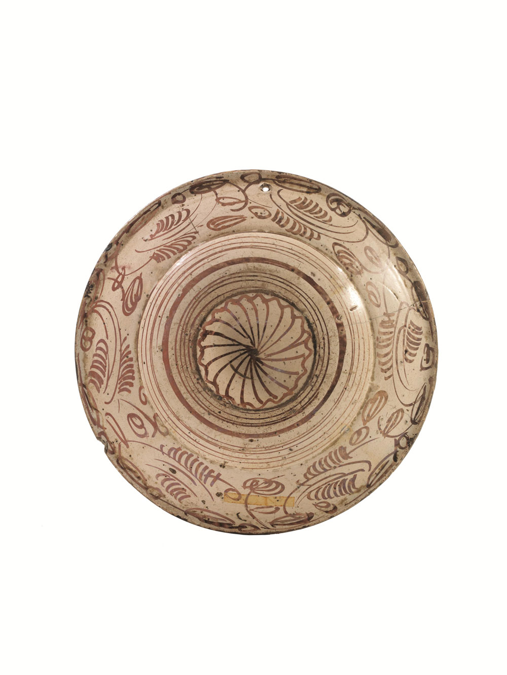 Il decoro a foglie bipartite, intervallate simmetricamente da un rametto anch’esso fogliato, si ripete lungo la tesa e nel cavetto. Al retro un caratteristico motivo decorativo a “foglie di felce”, tipico dei decori di questo periodo storico, nell’incavo che si forma in corrispondenza del cavetto e si fa più accentuato con un fiore stellato o ruota, anch’esso tipico di questa fase di produzione. In base alla decorazione, che sul fronte riprende il motivo cosiddetto “ad arbusto” e sul retro un motivo tipico della serie popolare, possiamo ipotizzare una probabile datazione riconducibile alla fine del XVI secolo. Il piatto è comunque poco comune tra quelli pubblicati e presenti nelle collezioni italiane. Sebbene non mostri stemmi al centro dell’umbone, ha mantenuto ancora il gusto più arcaico per la bicromia grazie all’utilizzo dell’azzurro.