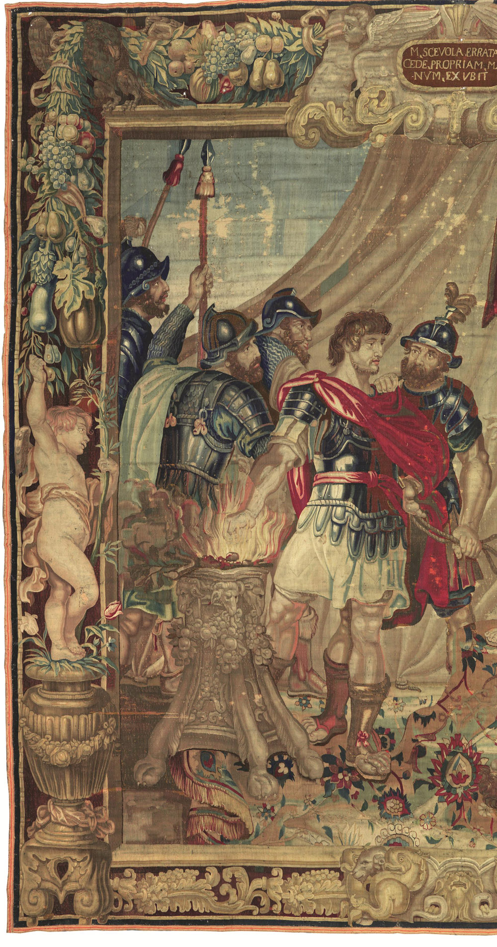 L’arazzo presenta una ricca bordura interamente ricamata con trofei, festoni vegetali e figure: a destra e a sinistra una coppia di putti alati poggianti su basamenti scolpiti a forma di vaso baccellato trattengono nella mano sinistra un alberello, mentre la mano destra è levata verso l'alto, da cui scendono ricchi festoni di fiori e frutta. In alto al centro un ricco cartiglio affiancato da protomi alate, nel cui centro sta l'iscrizione " M.SCEVOLA.ERRATA/CEDE.PROPRIAM.MA/NVM.EXVBIT "; ai margini superiori, tra festoni, sono due aquile. La fascia inferiore infine è decorata con ricchi fregi naturalistici, centrata da un mascherone con figure fantastiche ai lati.