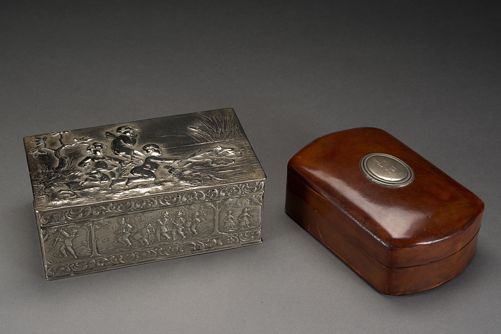 Lotto composto da una scatola in metallo argentato decorata a scene classiche e scene di vita ed una in pelle con cifre in argento