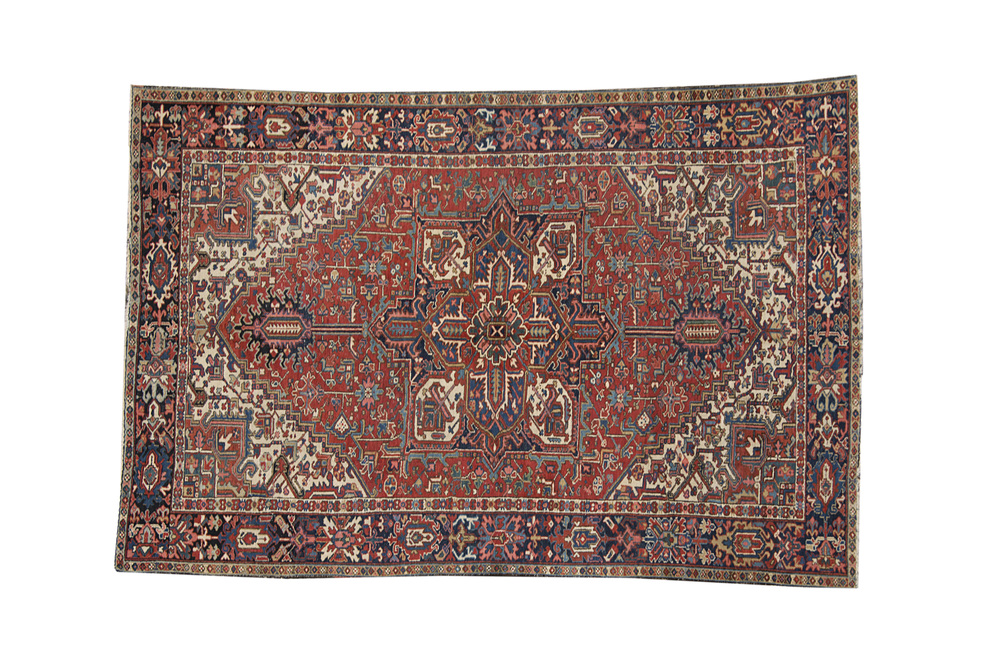 Tappeto Heriz a decorazione geometrica con disegno a medaglione su fondo rosso (cm 350x238)(difetti)
