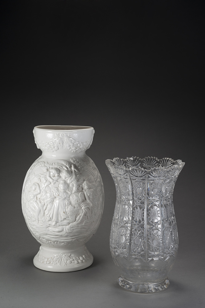 Lotto composto da un vaso in ceramica bianca decorato a figure classiche ed una in cristallo molato (difetti)