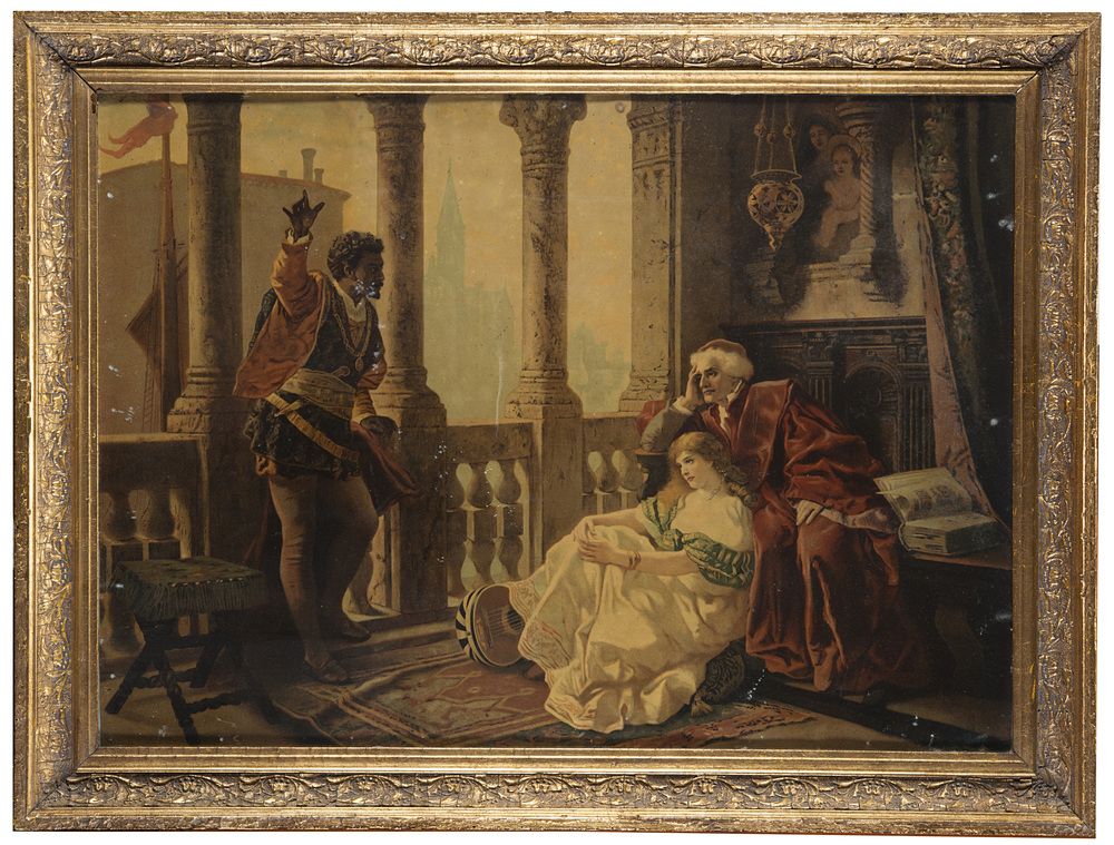 Oleografia del sec. XIX raffigurante una scena di genere con moro (cm 53x74) In cornice di legno e pastiglia dorata (difetti)