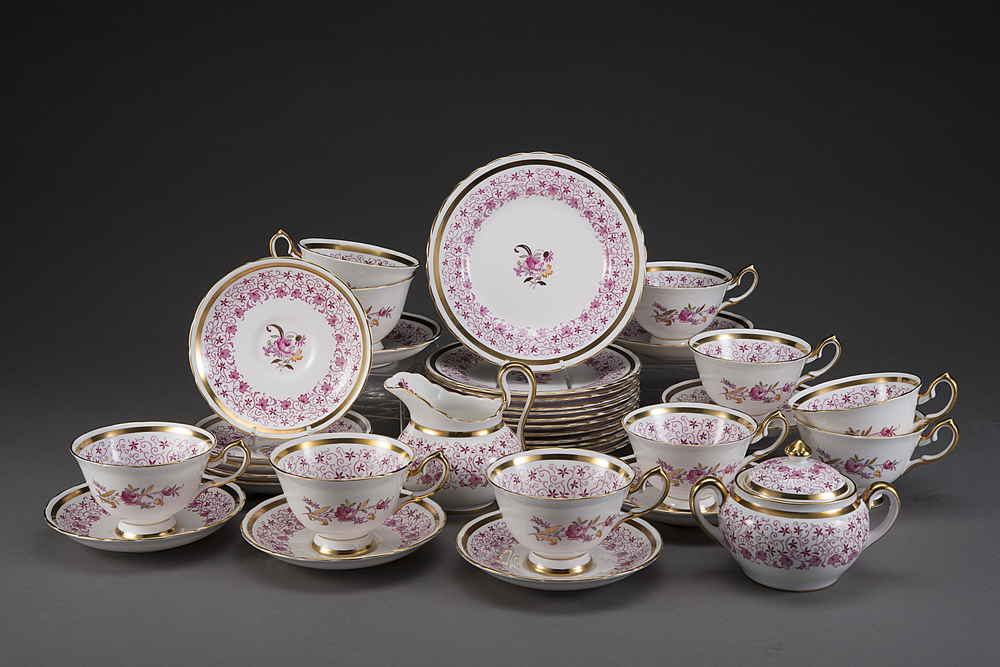 Manifattura inglese servizio da thè in porcellana decorata a fiori e dorature , composto da zuccheriera, lattiera, dieci tazze con piattini e dieci piatti da dolce