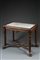 Tavolino da salotto di forma rettangolare con profili intagliati e decorati a motivi vegetali e stilizzati, gambe riunite da travertsa terminante a piedi ferini. Piano in marmo. Inizio sec. XX (cm 82x65x55)