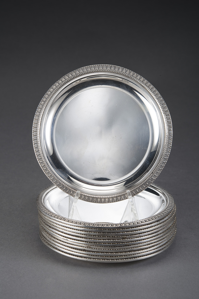 Gruppo di dodici sottobicchieri in argento con bordi decorati a palmette. Titolo 800, argentiere Nicoletti (gr 1180)