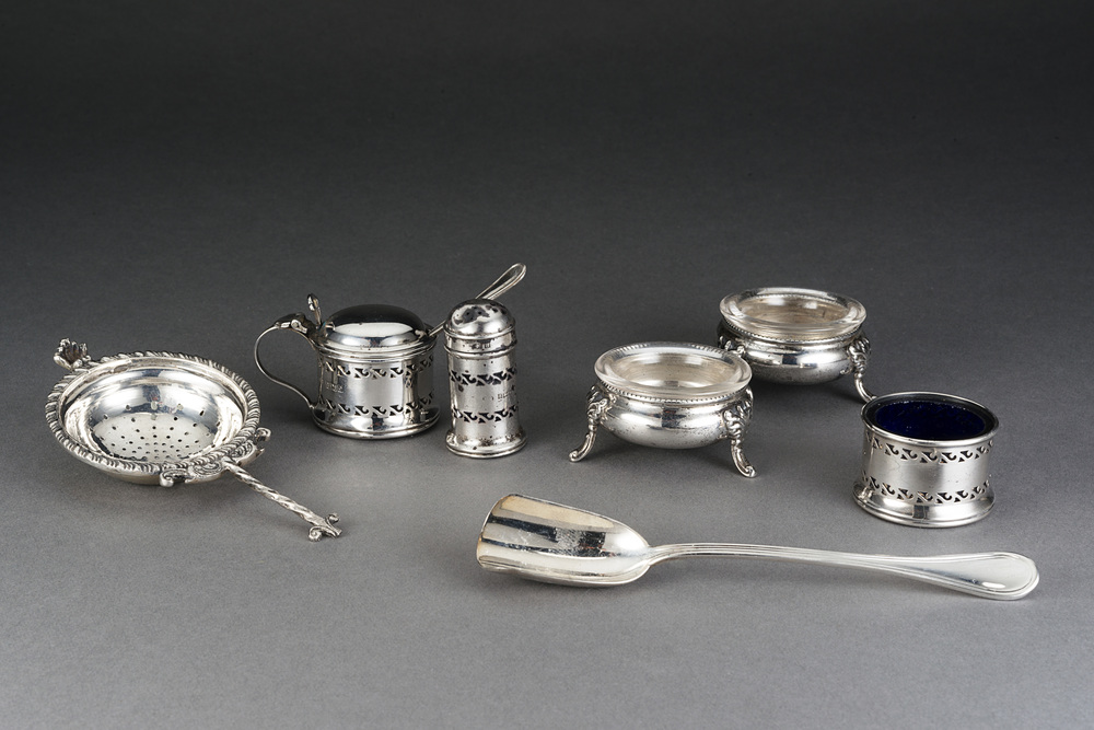Lotto composto da tre saliere, un sale e pepe , un cucchiaino ed un colino in argento e metallo argentato (difetti e mancanze)