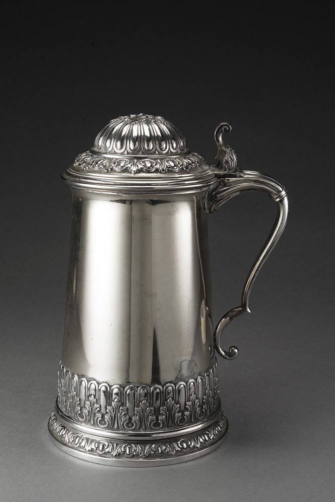 Boccale da birra in argento a corpo liscio con coperchio a fasce sbalzate a...