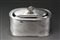 Scatola in argento con coperchio a corpo inciso a volute e medaglioni con fiori. Pomolo a cesto di frutta biansato . Titolo '800 (gr 850) Argentiere FC