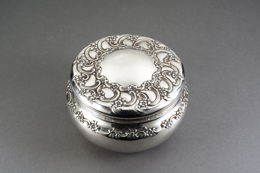 Scatola in argento con coperchio e fascia sbalzata a motivi vegetali. Titolo...