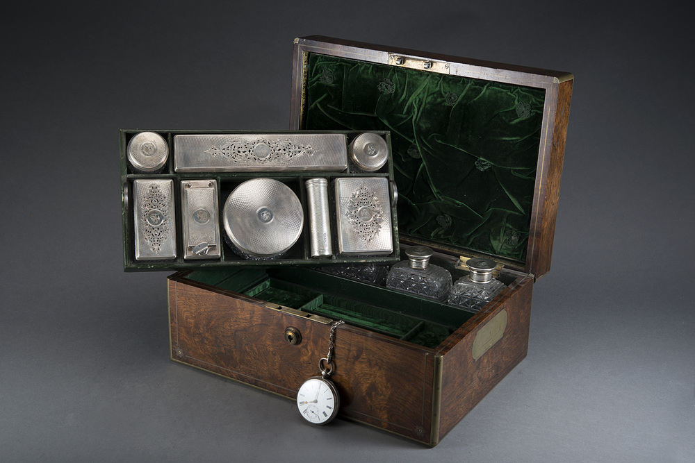 Servizio da toilette da viaggio con scatola in mogano filettato in ottone contenente numerose bottiglie ed accessori ed un orologio da tasca in vetro e argento cesellato, traforato e decorato a figure di volatili. Argentiere Thomas Diller, Londra 1840, 1841, scatola marcata Leight Ibramah Piccadilly E. J . Needs & Co . New Bond Street, Prov: Argenteria Marconi Milano (lievi difetti)