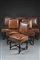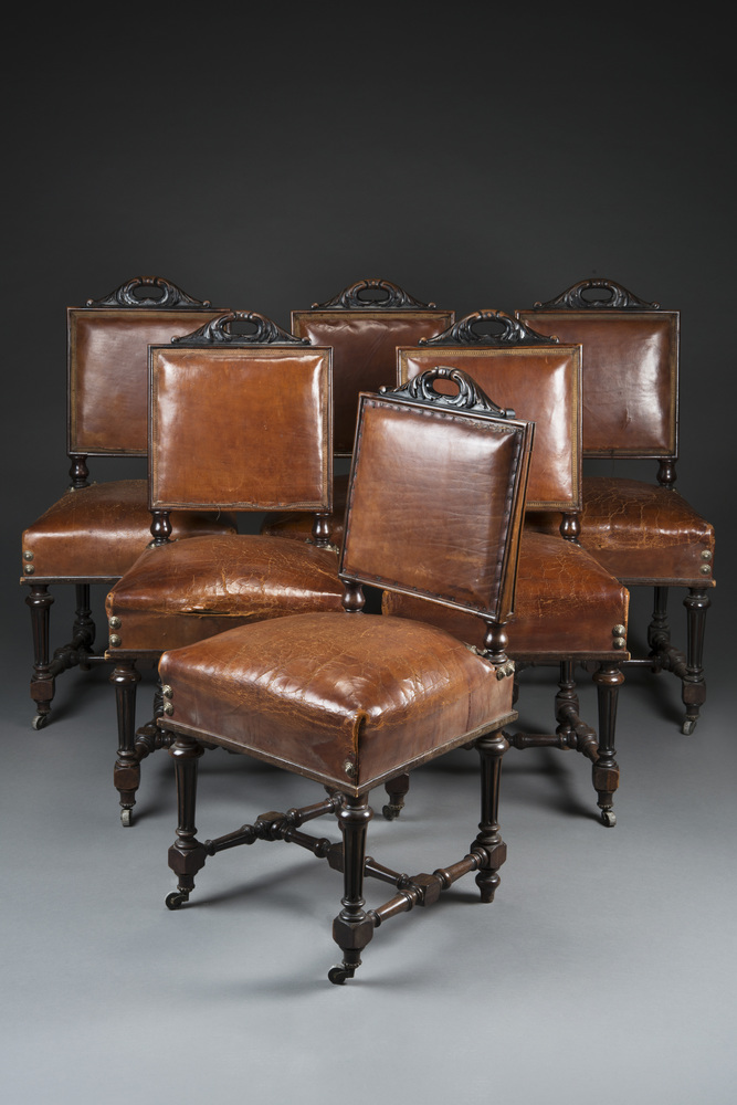Gruppo di sei sedie in noce con schienale decorato da cimasa intagliata e traforata, gambe e traverse tornite , sec. XIX. Rivestite in pelle borchiata (difetti)