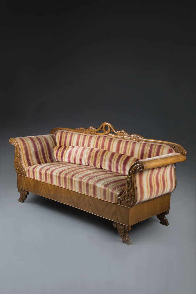 Divano con schienale intagliato ad animali fantastici e foglie e traforato, braccioli mossi scolpiti a motivi vegetali, fascia lastronata poggiante su piedi a zampa ferina e foglie d'acanto. Sec. XIX. Rivestito in velluto a righe