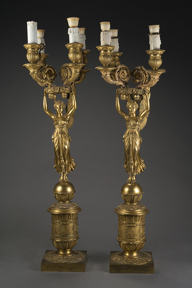 Coppia di candelieri in bronzo dorato a quattro fiamme decorati da figura a tutto tondo di vestale che sorregge braccia cesellate a volute, foglie d'acanto e fiori . Base tornita a decori classici poggiante su base squadrata . Inizio sec. XIX h cm58 (difetti)