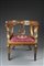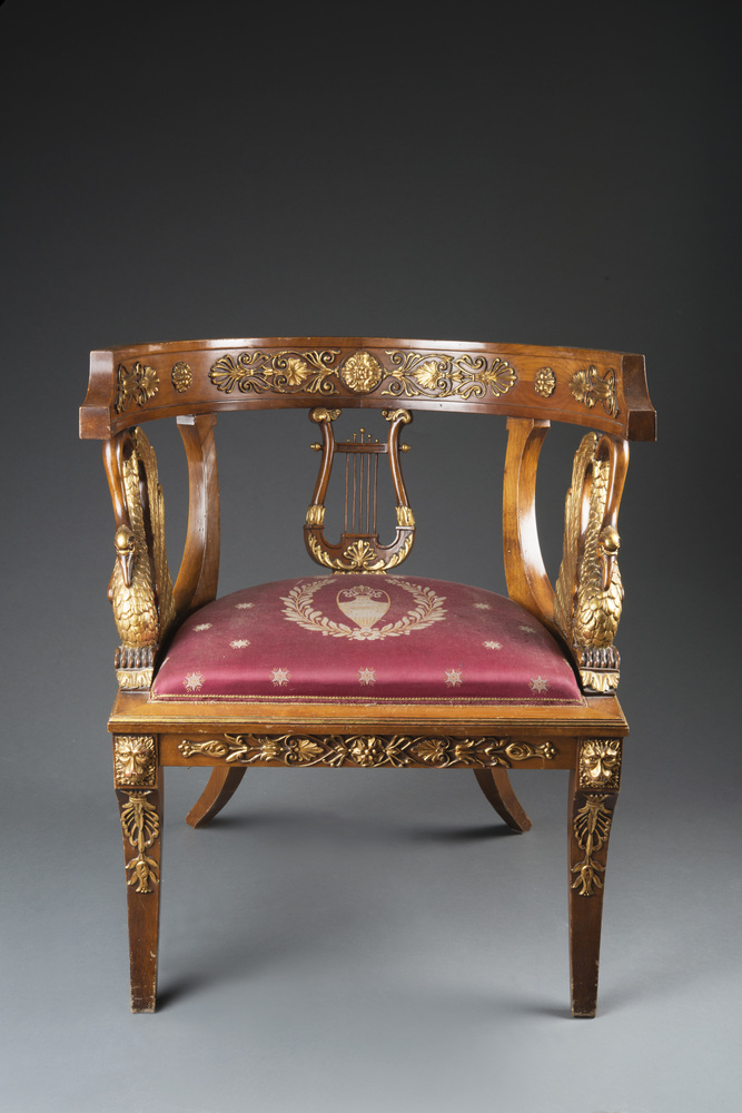 Poltrona a pozzetto con schienale decorato da fregi intagliati e dorati e da cartella a lira traforata. Montanti scolpiti a cigno a tutto tondo, gambe intagliate all'attacco con teste leonine e fregi classici di cui quelle posteriori a sciabola