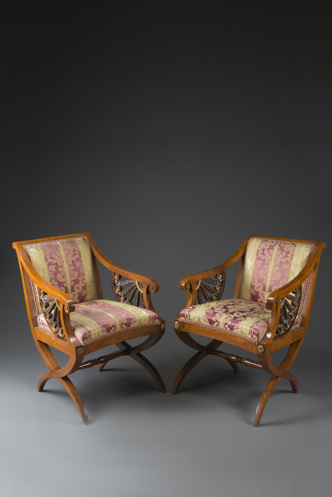Coppia di poltrone in mogano con braccioli mossi terminati a ricciolo decorati da fregi in noce intagliato a volute e dorato. Gambe a lira riunite da traverse tornite decorate all'attacco da rosoni dorati. Sec. XIX