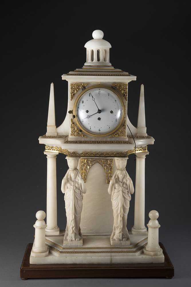 Pendola in alabastro in forma architettonica a tempio egizio/greco Vienna,...