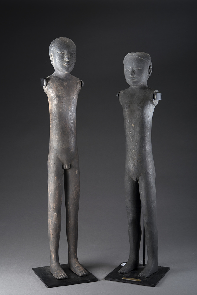 Lot 131 | Coppia di figure maschili in terracotta dipinta in nero (difetti), con...