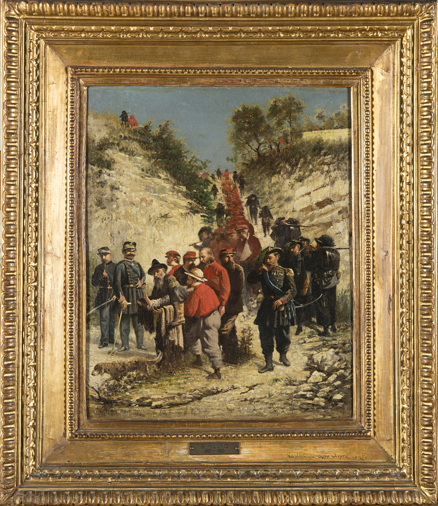 Maestro del sec. XIX "Garibaldi ferito all'Aspromonte" olio su tela (cm 40x30) In cornice coeva in legno intagliato e dorato, reca targhetta attributiva G. Induno (difetti e restauri)
