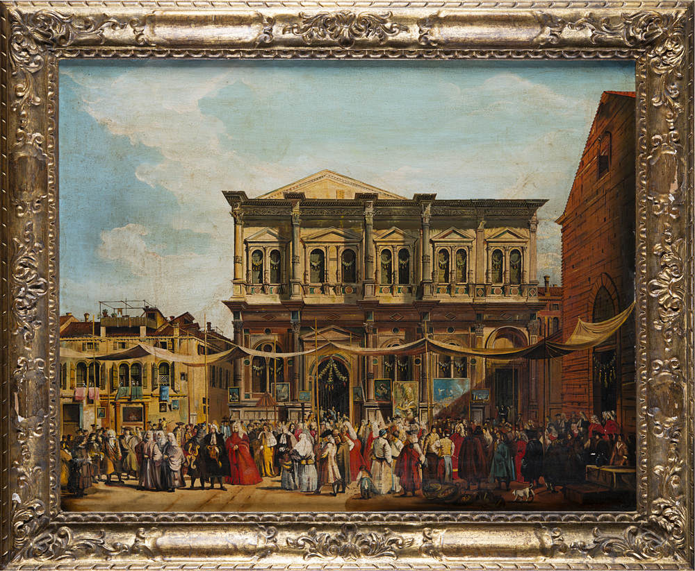 Lajos Ravasz da Canaletto "Visita del Doge alla chiesa di San Marco" olio su tela (cm 60x76). In cornice dorata