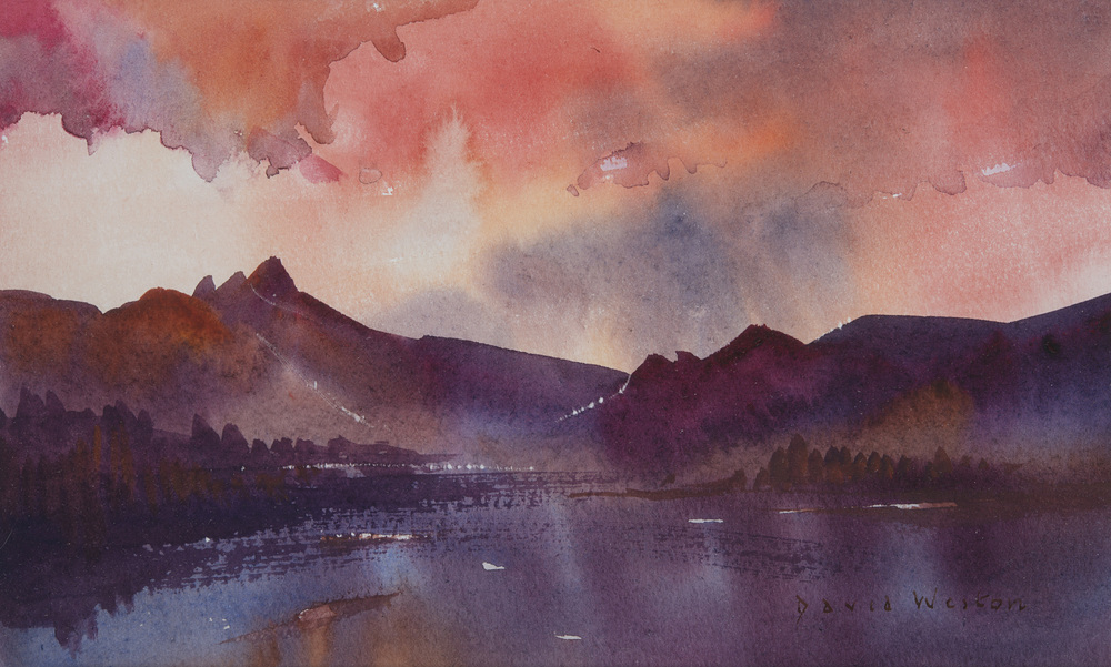 David Weston "Loch Lomond Sunset " acquarello su carta (cm 15x24) firmato in basso a destra. In cornice etichetta al retro