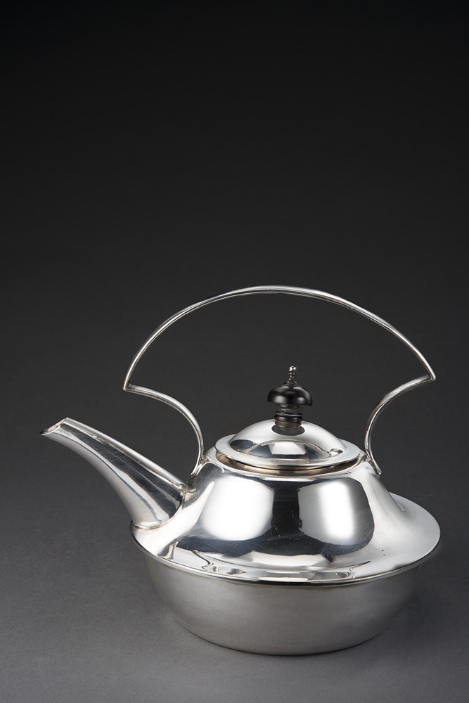 Teiera in metallo argentato con manico sagomato e presa in legno tornito ed ebanizzato, 1940 circa