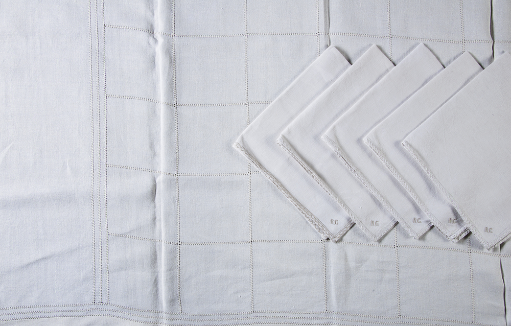 Tovaglia in lino con dodici tovaglioli con bordure decorate da motivi geometrici e cifre RG (cm 260x120)