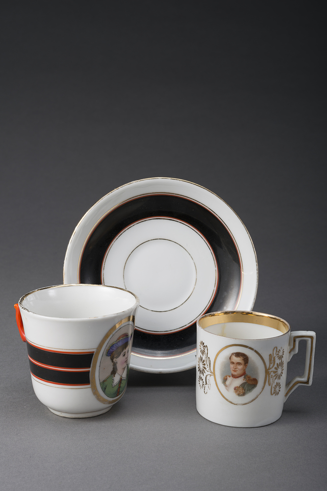 Manifatture diverse, lotto composto da una tazzina con piattino del secolo XIX decorata con profilo di donna ed una di epoca diversa con mezzo busto di Napoleone