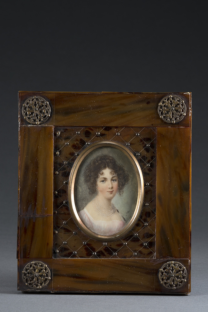 Scuola del sec. XX"Ritratto di donna" miniatura ovale (cm 6x4) In cornice lastronata in finta tartaruga (difetti e mancanze)