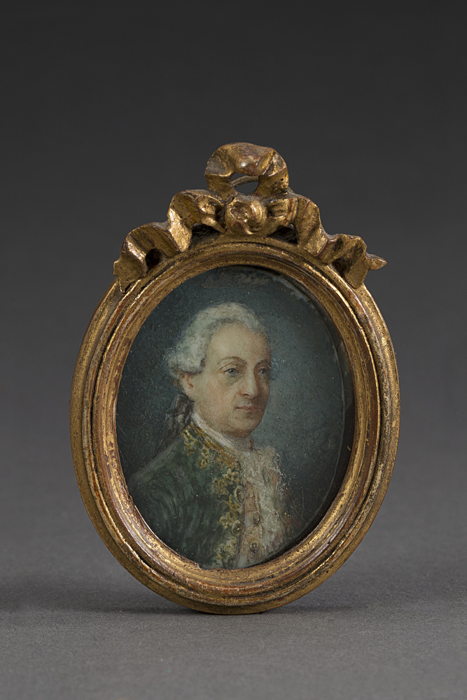 Scuola della fine del sec. XVIII "Ritratto di gentiluomo in abito verde" miniatura ovale su avorio (cm 4,5x3,5) in cornice di legno dorato con cimasa a fiocco