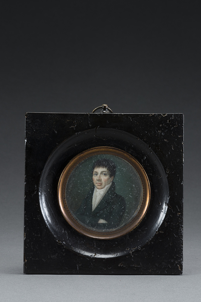 Maestro del sec. XIX "Ritratto di uomo" miniatura tonda su avorio (diam 16) In cornice di legno ebanizzato (difetti)