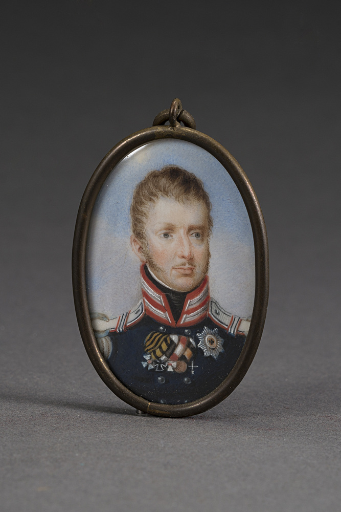 Scuola dell'inizio del sec. XIX "Ritratto di ufficiale" miniatura ovale su avorio (cm 4,5x 23) In cornice con etichetta manoscritta LANNS Jean al retro