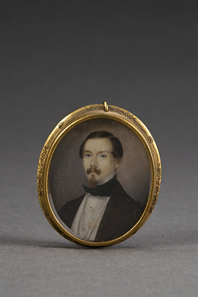 Scuola del sec. XIX "Ritratto di uomo con baffi e pizzetto" miniatura ovale su avorio (cm 3,5x3) In cornice ovale di bronzo dorato