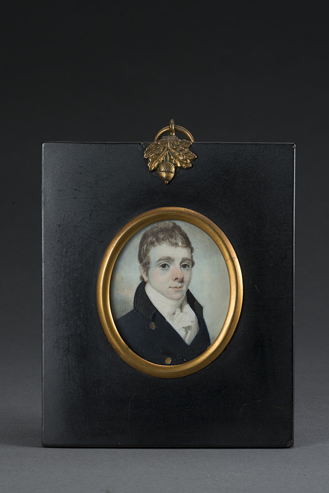 Maestro del sec. XIX "Ritratto di gentiluomo in cappotto blu " miniatura ovale su avorio (cm 4,5x5,5) In cornice ebanizzata