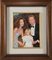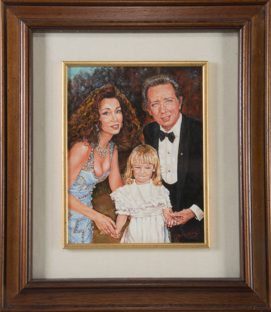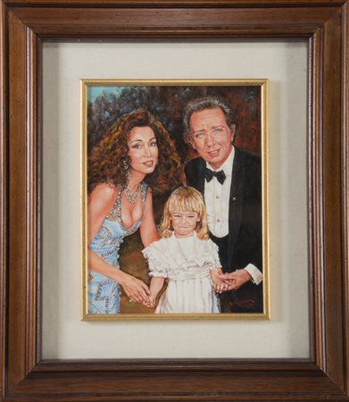 Olio su tavoletta raffigurante Mike Bongiorno con la famiglia (cm 34,5x27) In cornice. Firmato e datato in basso a destra Del Vecchio 1992