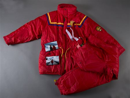 Tuta da scii composta da giacca e pantalone di colore rosso del Cervino Scii Club