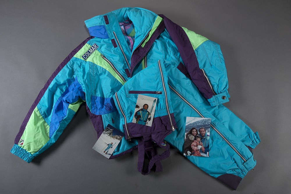 Tuta da scii Colmar composta da giacca e pantaloni di vari colori indossata da Mike