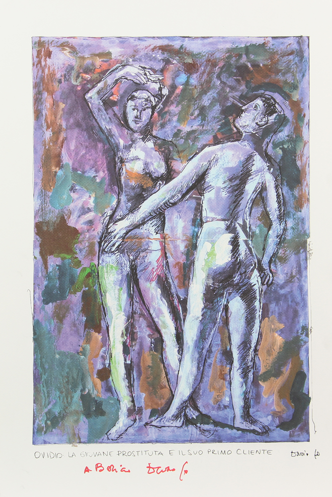 Dario Fo, Ovidio: La Giovane Prostituta e il suo Primo Cliente, stampa su carta, cm. 72x50,5, firmata e intitolata in lastra in basso, dedicata e firmata in basso al centro, senza cornice