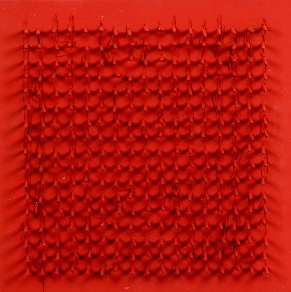 Bernard Aubertin, Tableau clous, 1970, acrilico e chiodi su tavola, cm. 20x20, firmato e datato al retro, certificato di autenticità dell'artista su fotografia, certificato di archiviazione dell'Archivio Opere Bernard Aubertin di Brescia su fotografia, certificato di provenienza della D.G. Arte Casa d'Arte di Treviso/Padova"