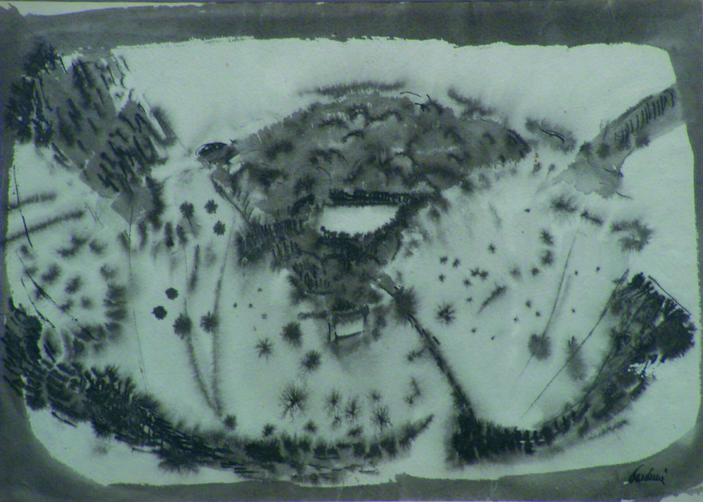 Enrico Paulucci, Paesaggio, guazzo in bianco e nero su carta antica, cm. 29,5x41, firmato in basso a destra, certificato di autenticità ed archiviazione dell'Archivio delle Opere di Enrico Paulucci su fotografia datato 2009