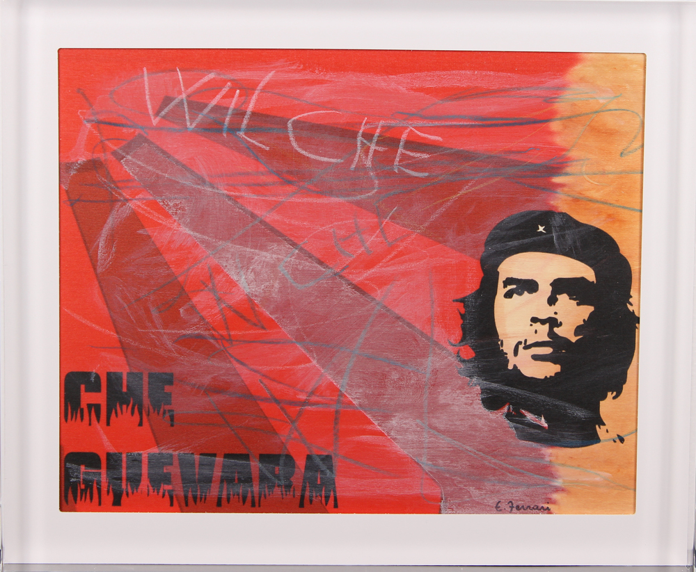 Enzo Ferrari, Che, tecnica mista su tavola entro teca di plexiglass, cm. 50x60, firmata in basso a destra, firmata e intitolata al retro, timbro dell'Associazione Nazionale Amici de “Il Quadrato” al retro, certificato di autenticità dell'artista su fotografia"