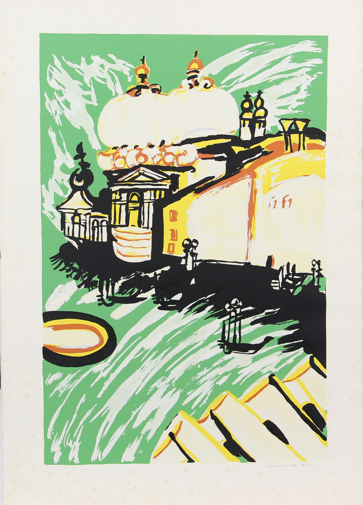 Remo Brindisi, Venezia, litografia su carta, cm. 70x50, es. 38/99, firmata in basso a destra, sono presenti macchie di umidità, l'opera à accompagnata da una fotografia che raffigura l'artista mentre firma una litografia della stessa tiratura, senza cornice