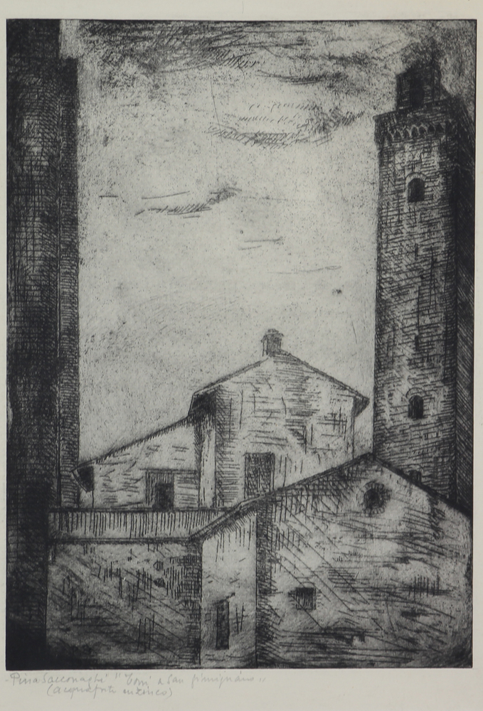 Pina Sacconaghi, Torri a San Gimignano, acquatinta a zinco su carta, cm. 37x25 (lastra cm. 28,5x20,5), firmata e intitolata in basso a sinistra