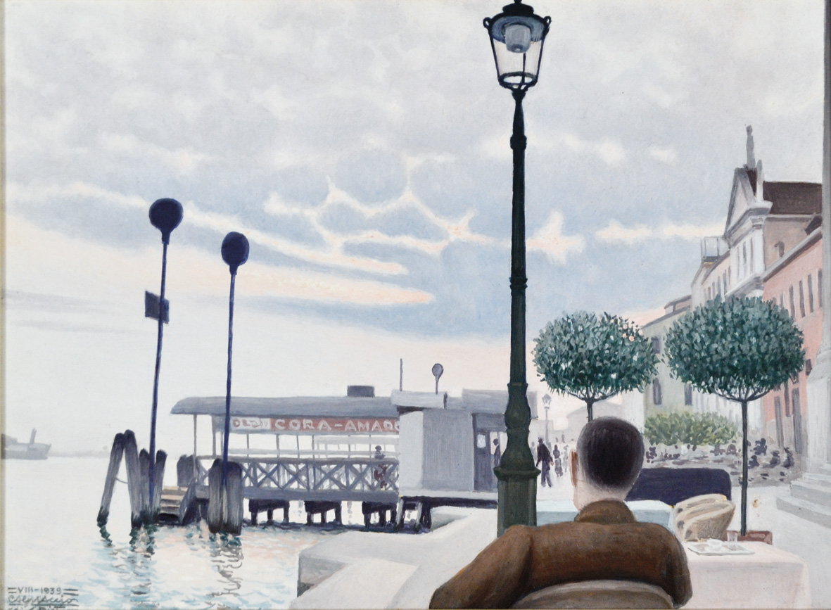 CAGNACCIO DI SAN PIETRO Desenzano (Bs) 1897 - Venezia 1946 Tramonto dai Gesuati 1939 olio magro su tavola 22x29 firma e data in basso a sinistra XXII esposizione Biennale Internazionale d'Arte Venezia 1940 - etichetta al retro